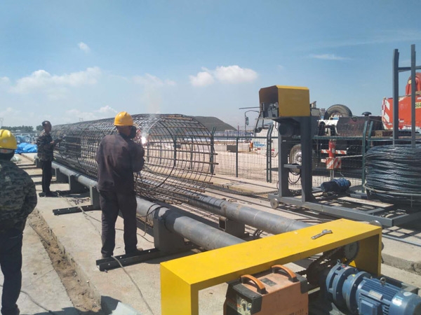 2、鋼筋籠12米以上,或者單節(jié)鋼筋籠較重時,骨架中間加焊1、2圈纏繞筋替代第三個過渡箍?;蛑苯又虚g開始繞筋,另半截籠前面向中間纏繞連接完成。所以三個過渡箍的中間一個箍應(yīng)置放在中間靠后面的地方,借以減少沖擊振動。退出輥輪并過渡到后面輥輪的方法--將過渡箍向后面推壓,讓過渡箍順膠輥旋轉(zhuǎn)到上面直到全部退出。準(zhǔn)備臺架;若采用骨架直接滾進輥輪內(nèi)檔(小型鋼筋籠),骨架制作臺架高度與設(shè)備同高。